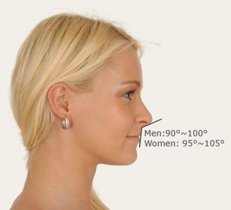 This is the angle defined by columellar point-to-subnasale line intercepting with subnasale-to-labrale superius line. Normally between 90°-120°, the aesthetic angle is 90°-100° for male and 95°-105° for female. An acute nasolabial angle can lead to a droopy nose, whereas an obtuse nasolabial angle can lead to a short or ‘uplifted’ appearance.
